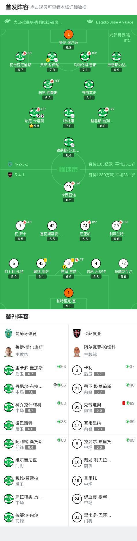 第43分钟,葡萄牙体育球员贡萨洛-伊纳西奥助攻热尼-卡塔莫打入一球。